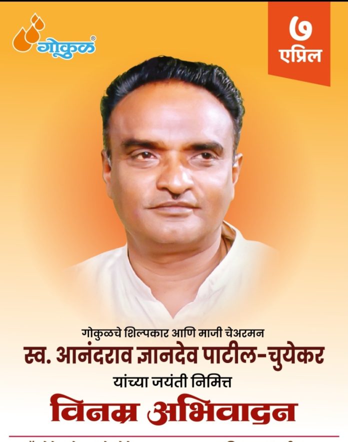 कोल्हापूर जिल्हा सहकारी दूध उत्पादक संघ (गोकुळ) चे संस्थापक व शिल्पकार स्व. आनंदराव ज्ञानदेव पाटील-चुयेकर यांची 88 वी जयंती ताराबाई पार्क येथील संघाच्या कार्यालयात उत्साहात साजरी करण्यात आली. यावेळी त्यांच्या प्रतिमेला पुष्पहार अर्पण करून अभिवादन करण्यात आले.
