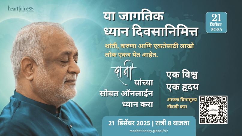आजच्या अस्थिर, तणावपूर्ण आणि धावपळीच्या जीवनशैलीत अंतःकरणातील शांतता जपणे अत्यंत गरजेचे झाले आहे. याच पार्श्वभूमीवर हार्टफुलनेस ध्यान पद्धतीचे आध्यात्मिक मार्गदर्शक दाजी (Daaji) यांनी जागतिक ध्यान दिन निमित्ताने संपूर्ण मानवजातीला सामूहिक ध्यान करण्याचे आवाहन केले आहे.