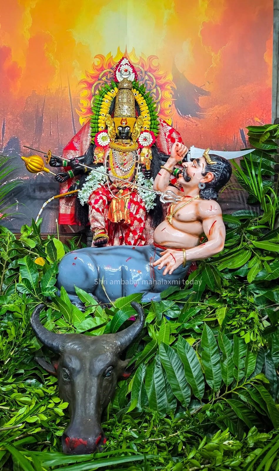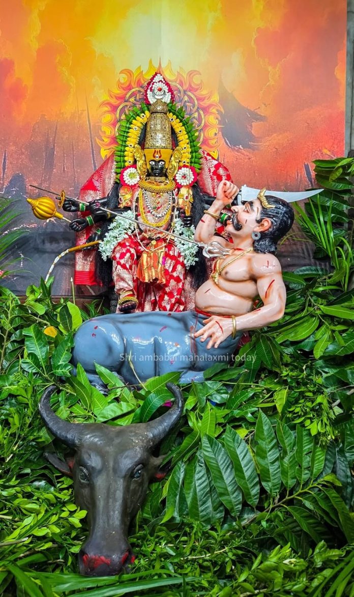 आज मंगळवार, अश्विन शुक्ल अष्टमीच्या दिवशी करवीर मधील निवासिनी श्री आई अंबाबाई महिषासुरमर्दिनी रूपात भक्तांसमोर प्रकट झाली आहे. मंदिर परिसरात सकाळपासूनच भाविकांची गर्दी आहे, तर प्रत्येक भाविक देवीच्या पराक्रमी रूपाचे दर्शन घेण्यासाठी उत्सुक आहे.