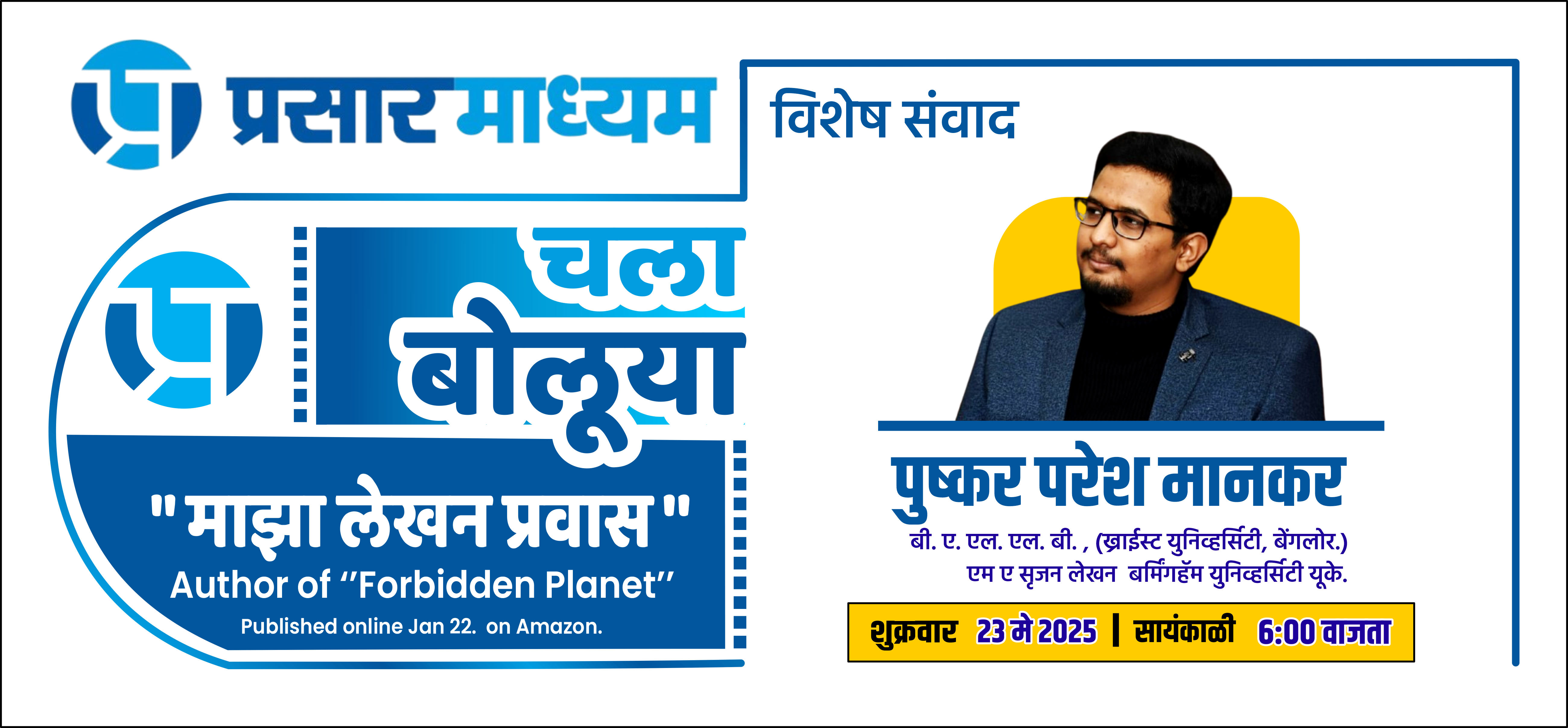 या कार्यक्रमात त्यांचा लेखनप्रवास, त्यामागील प्रेरणा, परदेशातील शिक्षणानुभव, आणि सर्जनशीलतेच्या वाटेवर आलेल्या अडथळ्यांबद्दल सखोल संवाद होणार आहे. नवोदित लेखकांसाठी आणि सर्जनशील क्षेत्रात रस असलेल्या प्रत्येकासाठी हा कार्यक्रम निश्चितच प्रेरणादायी ठरणार आहे.